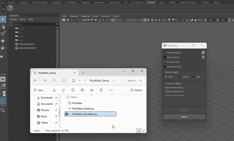 drag and drop PolyMate_Uninstaller.py into Maya’s viewport.